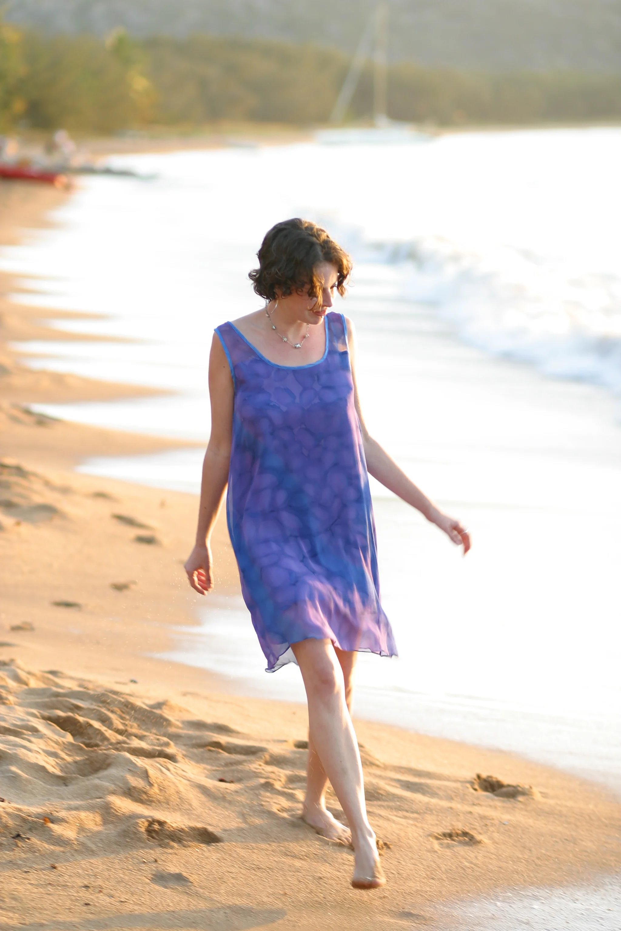 Silks in various weights & weaves are hand painted by brush with steam set dyes. A rainbow palette of colours & designs inspired by nature.